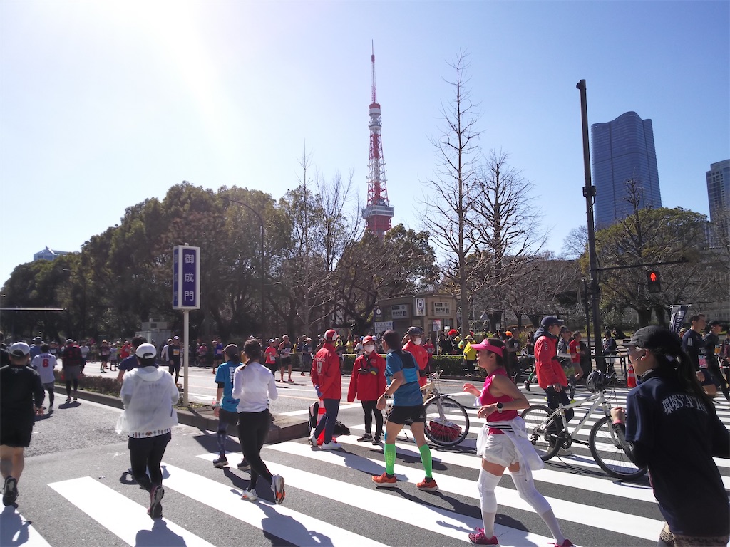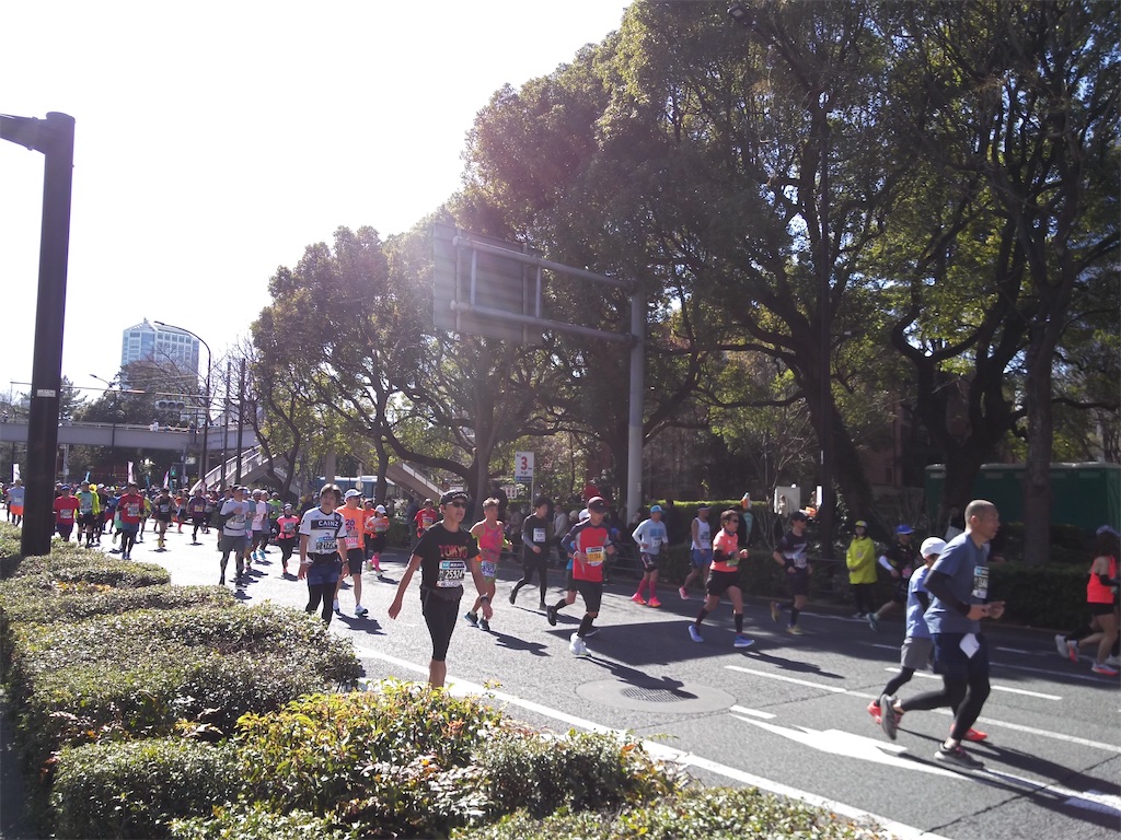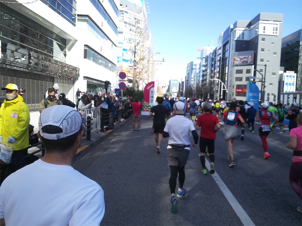 深川の救護所で飲んだOS-1が効いたのかな…救護所にまた寄ろうかなと考えていたのですが、様子見ようということでスルー。そこから最初の1kmは様子見で走りましたが、痙攣する事がなかったので、その後はラップタイムで6分前半から5分後半くらいまでペースアップできました。